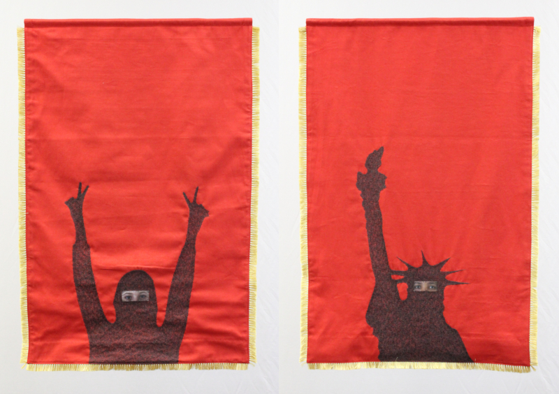 Die beiden Silhouetten bestehen aus vielen einzelnen Stichen, ausgeführt mit Nadel und Faden. Die Stiche verlaufen kreuz und quer. Durch die Verdichtung der Stiche entsteht eine Fläche. Das Leben ist eine Verdichtung von einzelnen Ereignissen. Die Verdichtung als Konzentrat. Nur wenn man sich auf etwas konzentriert, nimmt es Gestalt an. Den beiden Motive sind Abbildungen von Augenpaare eingearbeitet. Es gibt in der deutschen Sprache die Redewendung Sich etwas auf die Fahne schreiben. Indem man das eigene Ziel für alle sichtbar auf einer Fahne öffentlich präsentiert, wird gezeigt wofür man sich einsetzt. Die Fahne entstand für das Ausstellungsprojekt "FREIHEIT", 2023, Bamberg. Entstehungsjahr: 2023 |